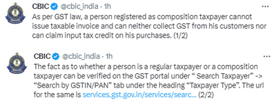 A recent tweet by the Central Board of Indirect Taxes & Customs (CBIC), has clarified that as per the Goods and Services Tax (GST) law, a person registered as a composition taxpayer cannot issue a taxable invoice and can neither collect GST from his customers nor can claim the input tax credit on his purchases.