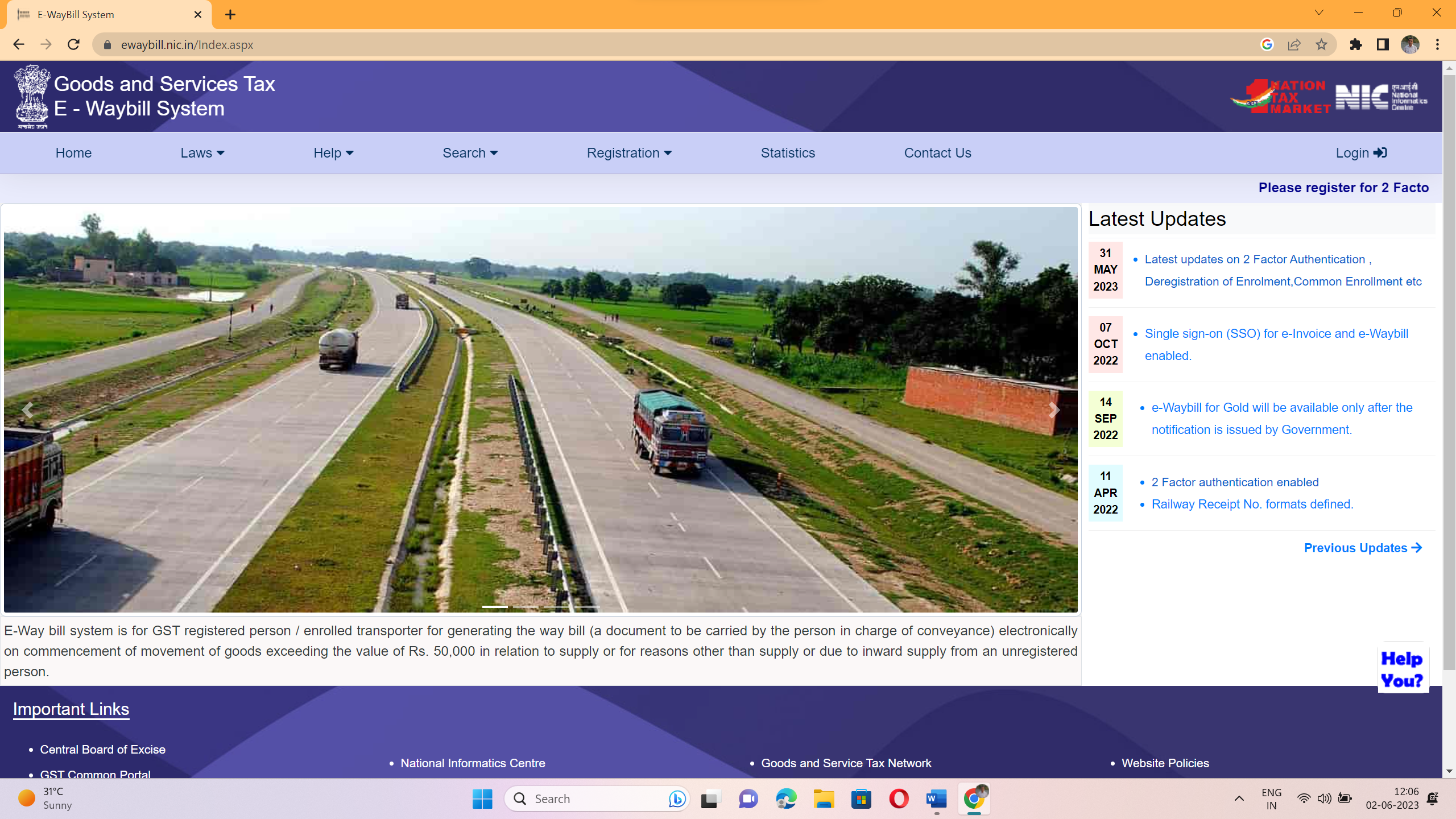 2 Factor authentication: In order to secure the e-waybill login access, 2 Factor Authentication (2FA) is enabled and kept optional. However, after couple of weeks, 2FA will be made mandatory. The users operating e-waybill system from multiple locations and with single credential are advised to create sub-users immediately.