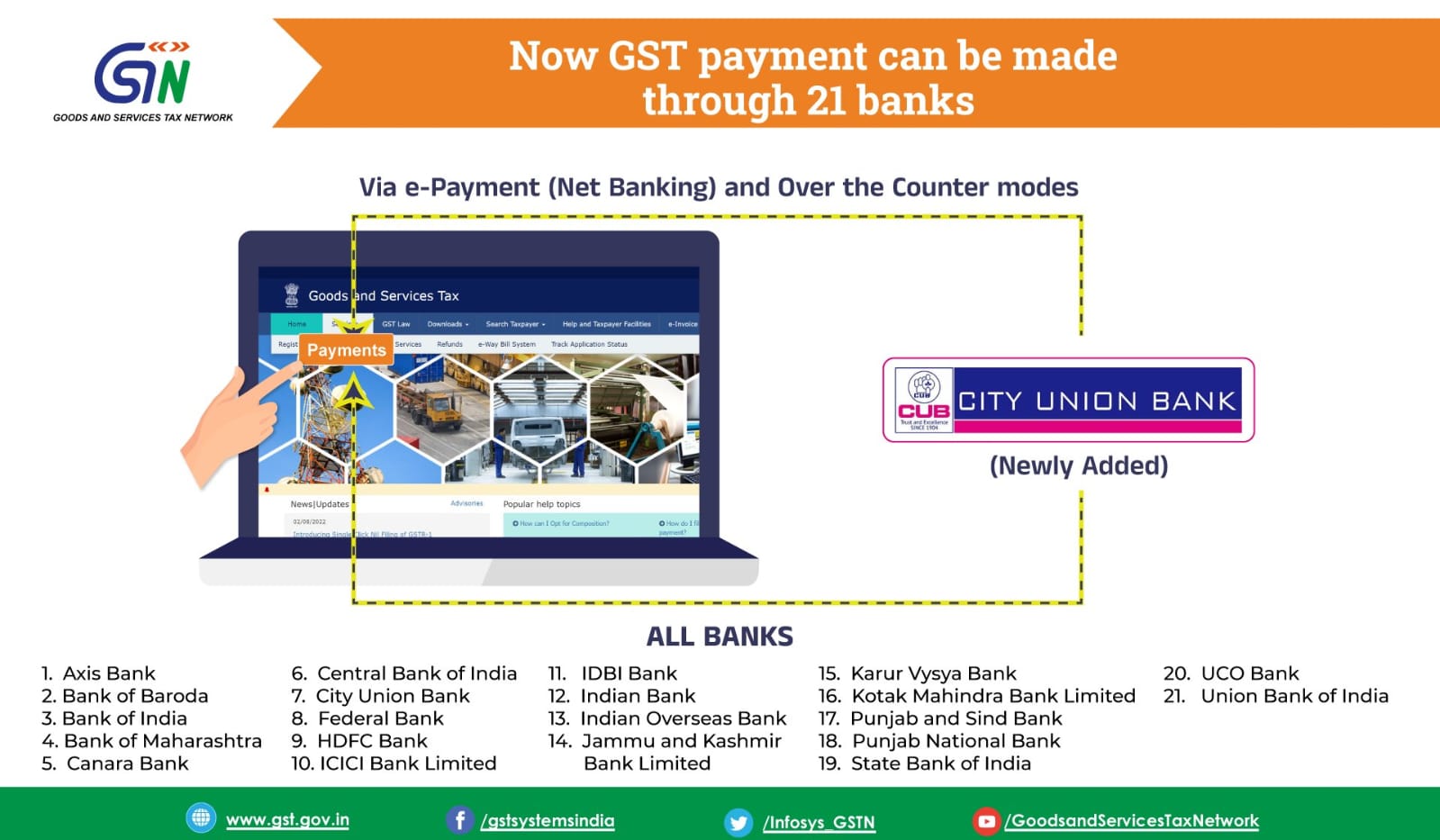 The Goods and Services Tax Network ("GSTN") has added "City Union Bank" to make GST payment via e-payment (Net Banking) and Over the Counter modes.