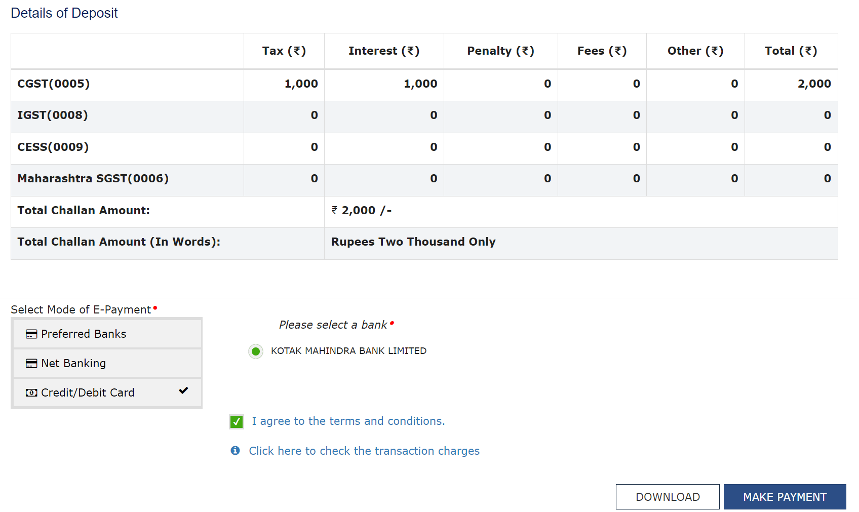 The taxpayers are advised to check the transaction charges before selecting the Credit Card, Debit Card and BHIM UPI sub-payment mode. The transaction charges if any, will be applicable over and above the tax amount in this payment option. Kindly refer to the respective Bank's site for more details.